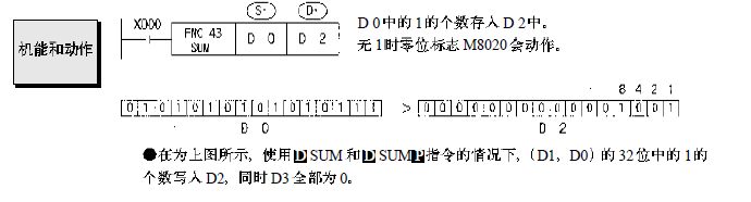 三菱的ON位數(shù)統(tǒng)計(jì)指令SUM (D)SUM(P)指令,該指令是用來(lái)統(tǒng)計(jì)指定元件中1的個(gè)數(shù)。如圖4所示,當(dāng)X0有效時(shí)執(zhí)行SUM指令,將源操作數(shù)D0中1的個(gè)數(shù)送入目標(biāo)操作數(shù)[D2中,若D0中沒(méi)有1,則零標(biāo)志M8020將置1。