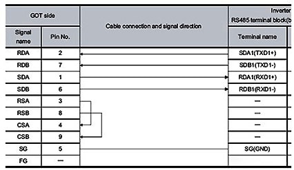 外部接線:三菱的觸摸屏手冊(cè)中講到了可以通過觸摸屏的422口和變頻器的485口直接通訊,這條電纜可以自已制作,接線圖如下:
