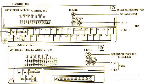 (2)遠(yuǎn)程I/0站的設(shè)置為,AJ65BTB2-16D模塊的站號(hào)設(shè)置開(kāi)關(guān):01 AJ65BTC1-32T模塊的站號(hào)設(shè)置開(kāi)關(guān):02 ,他們的傳輸速度/模式設(shè)置開(kāi)關(guān)都設(shè)置為:0 如下圖所示: