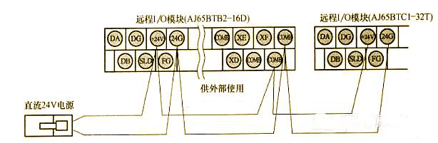 (2)直流24V線路連接。遠(yuǎn)程I/O站(內(nèi)部和外部I/O)的直流24V電源線的連接如下圖所示。連接前一定要斷開(kāi)電源,注意正負(fù)極性。