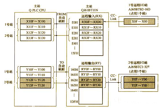 (1)數(shù)據(jù)的刷新。Q CPU主站的緩沖存儲(chǔ)器的遠(yuǎn)程I/O站的刷新關(guān)系(RX/RY)。如下圖所示: