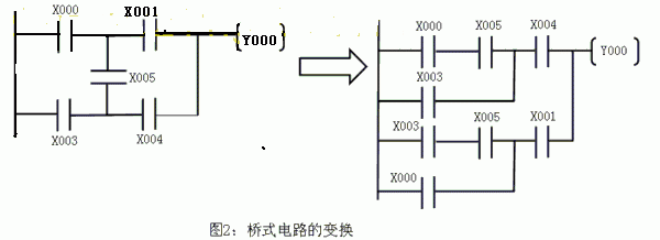 圖(b)中,X001和X002接點控制輔助繼電器M000,X003~X005接點控制輔助繼電器M001,再由兩個繼電器M000,M001接點的并聯(lián)組合去控制線圈Y000。這樣邏輯關(guān)系沒變,卻把雙線圈變成單線圈。