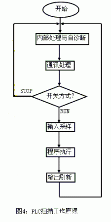 PLC的CPU采用循環(huán)掃描的工作方式。一般包括五個階段(如圖所示):內(nèi)部診斷與處理,與外設(shè)進行通訊,輸入采樣,用戶程序執(zhí)行和輸出刷新。當方式開關(guān)處于STOP時,只執(zhí)行前兩個階段:內(nèi)部診斷與處理,與外設(shè)進行通訊。