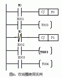 注意:我們所說的是不宜(最好不要)使用雙線圈,雙線圈使用并不是絕對禁止的,在一些特殊的場合也可以使用雙線圈,這時就需要你有較豐富的編程經(jīng)驗和技巧了。下面我們會談到這一點。但對于初學者還是不要冒這個險。其實,從以上的例子可以看出,重復利用線圈之所以會造成Y003的輸出混亂,是由于程序是從上到下順序執(zhí)行的緣故造成的。但如果我們可以改變程序執(zhí)行的順序,保證在任何時刻兩個線圈只有一個驅(qū)動邏輯發(fā)生,就可以使用雙線圈。其中,最常用的方法就是使用跳轉(zhuǎn)指令。如下圖所示: