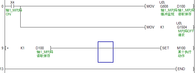 下面是一個把“ Md.25 有效M代碼”讀入PLC CPU 數(shù)據(jù)寄存器(D110)的順