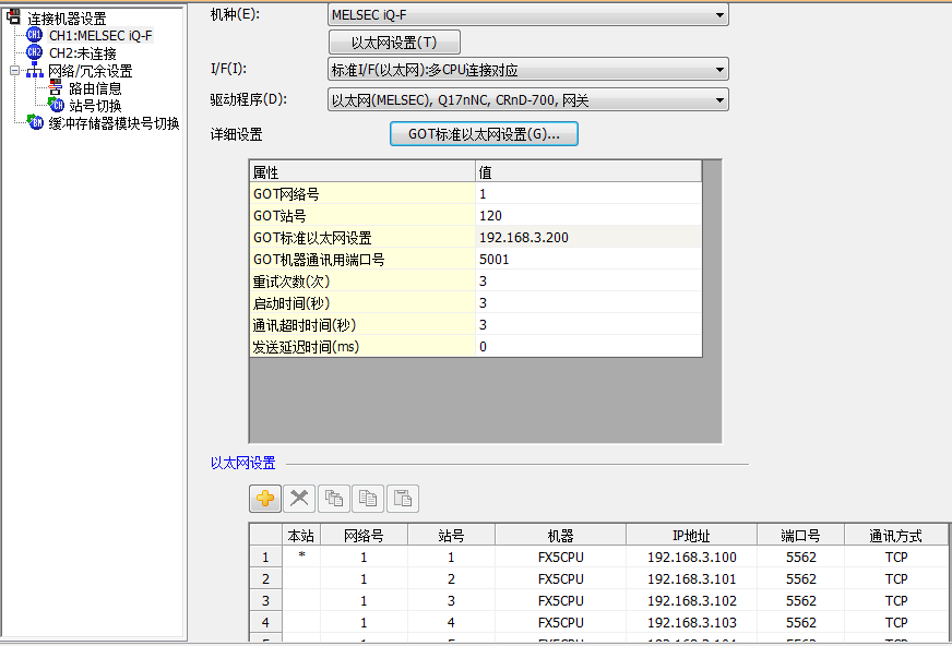 1:三菱觸摸屏IP地址設(shè)置、站號(hào)設(shè)置,連接三菱FX5U系列PLC的IP地址設(shè)置、站號(hào)設(shè)置,保證處于同一個(gè)網(wǎng)絡(luò),站號(hào)不同即可。