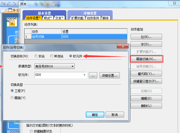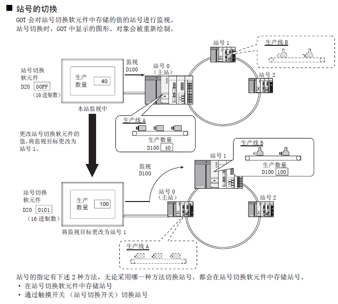 二:實(shí)際使用中根據(jù)不同機(jī)臺(tái)切換站號(hào)即可,三菱觸摸屏支持站號(hào)切換,將站號(hào)規(guī)定為軟元件從而靈活設(shè)置站號(hào)的切換